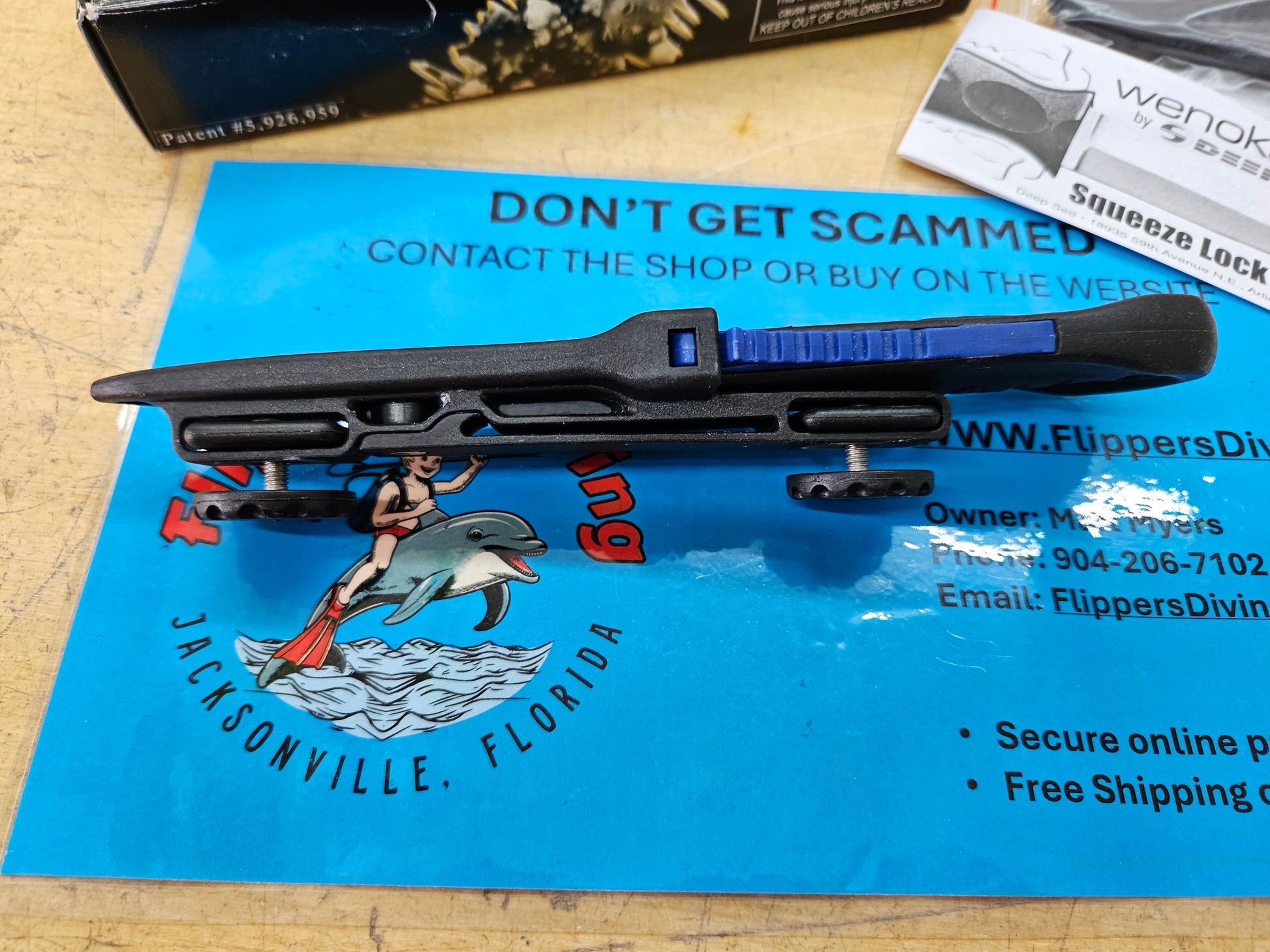 New Old Stock! Still in the box with all accessories... Wenoka Squeeze Lock dive tool. "Blackie Collins" edition. Stainless steel, blunt tip, serrated on one side and sharp blade on the other. Comes with sheath, rivet mounts or can be used with a belt strap. Squeeze lock allows you to pinch and pull to remove and push it back in to automatically lock into place. Excellent tool!